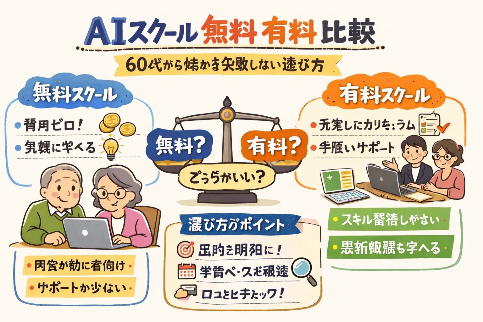 本記事では、流行の言葉に惑わされることなく、60〜70代の皆様が直面する「孤独感」「取り残される不安」そして「生活に彩りを与える副収入」という切実なニーズに寄り添い、無料と有料のAIスクールを徹底的に比較・検証しました。