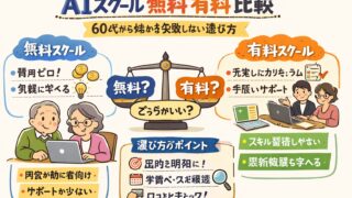 AI教材レビュー AIスクール 無料 有料 比較|60代から始める失敗しない選び方 AIスクールの無料・有料をシニア視点で徹底比較!定年後の知的好奇心を副収入や社会との繋がりに変える、賢い選び方をプロが解説します。挫折しないサポート体制やコミュニティなど、後悔しない投資の基準を伝授。 2026.03.15 AI教材レビュー